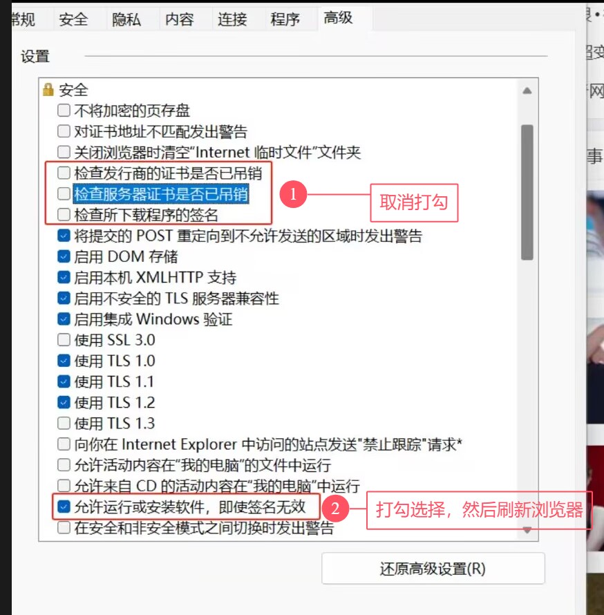 5、将检查服务器证书是否已吊销取消勾选、选择允许运行或安装软件,即使签名无效,然后再去刷新浏览器。